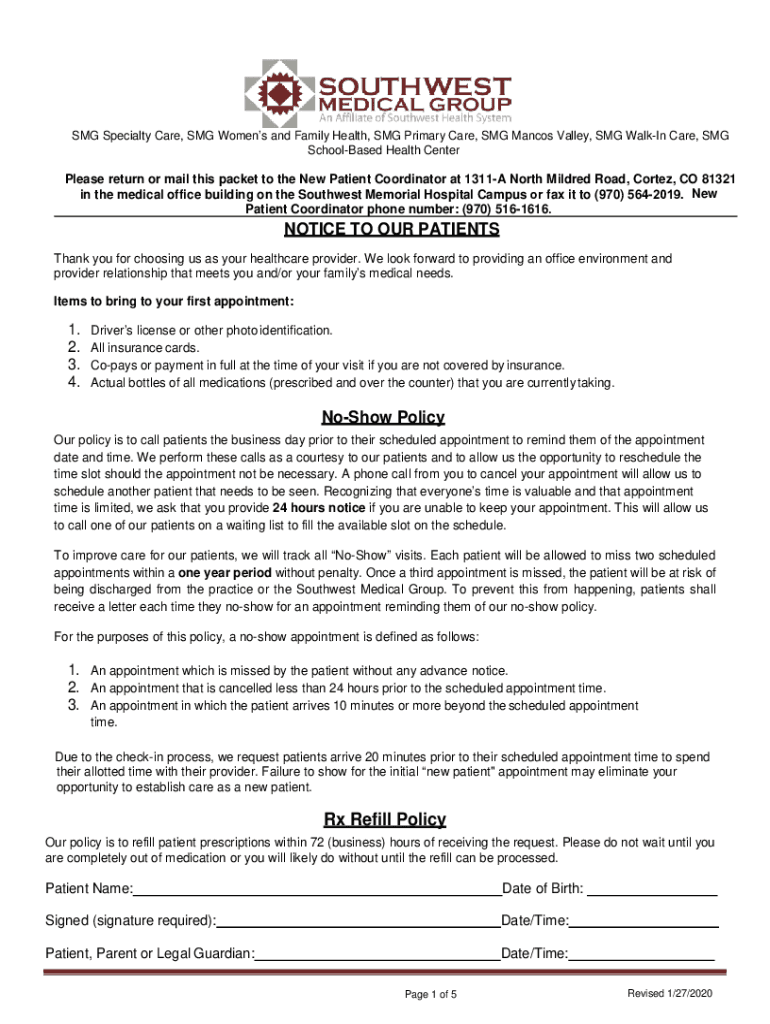 SMG Specialty Care, SMG Women's and Family Health, SMG Primary Care, SMG Marcos Valley, SMG Walking Care, SMG Schooled Health Centerpiece return or mail this packet to the New Patient Coordinator
