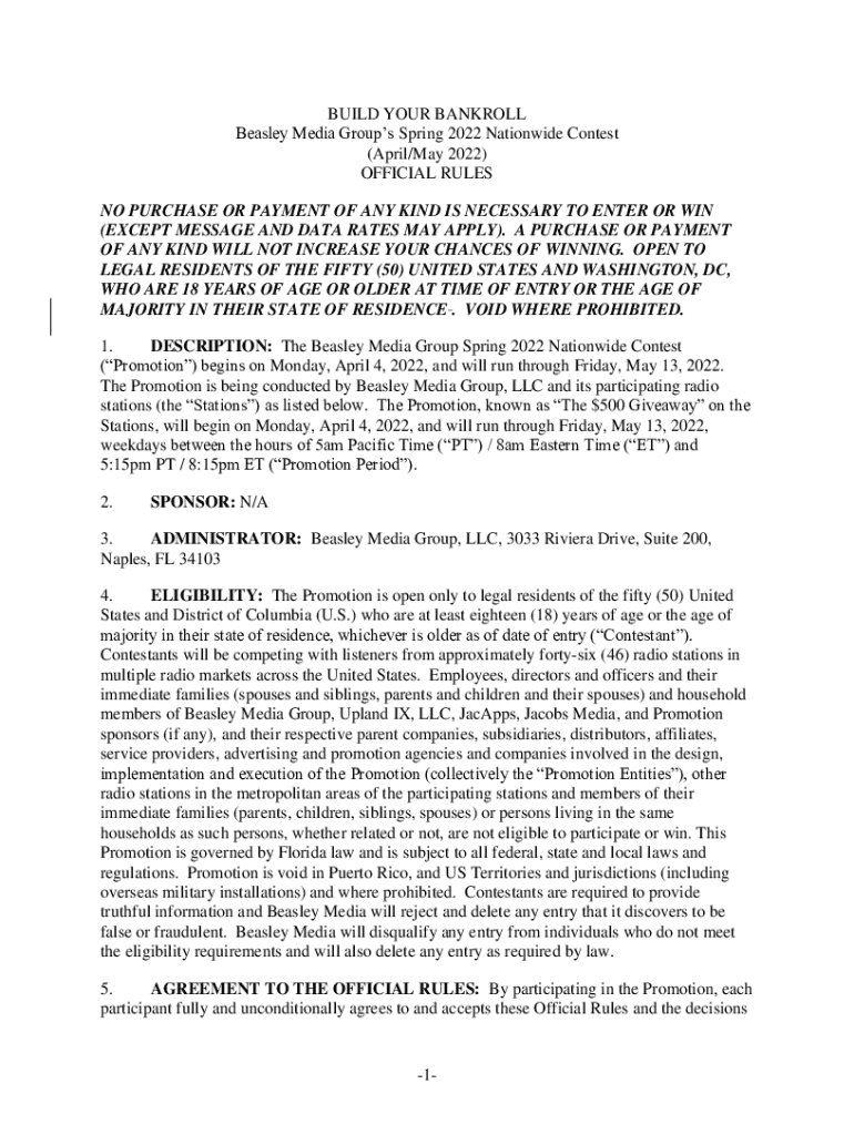 BUILD YOUR BANKROLL Beasley Media Groups Spring 2022 Nationwide Contest (April/May 2022) OFFICIAL RULES NO PURCHASE OR PAYMENT OF ANY KIND IS NECESSARY TO ENTER OR WIN (EXCEPT MESSAGE AND DATA RATES