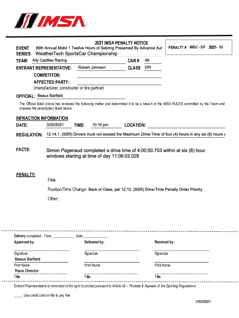 20 IMA PENALTY NOTICE EVENT SERIES: TEAM: CAR # ENTRANT REPRESENTATIVE: CLASS COMPETITOR: AFFECTED PARTY: (manufacturer, constructor or tire partner)PENALTY # ISC SP03OFFIC AL: The Official listed