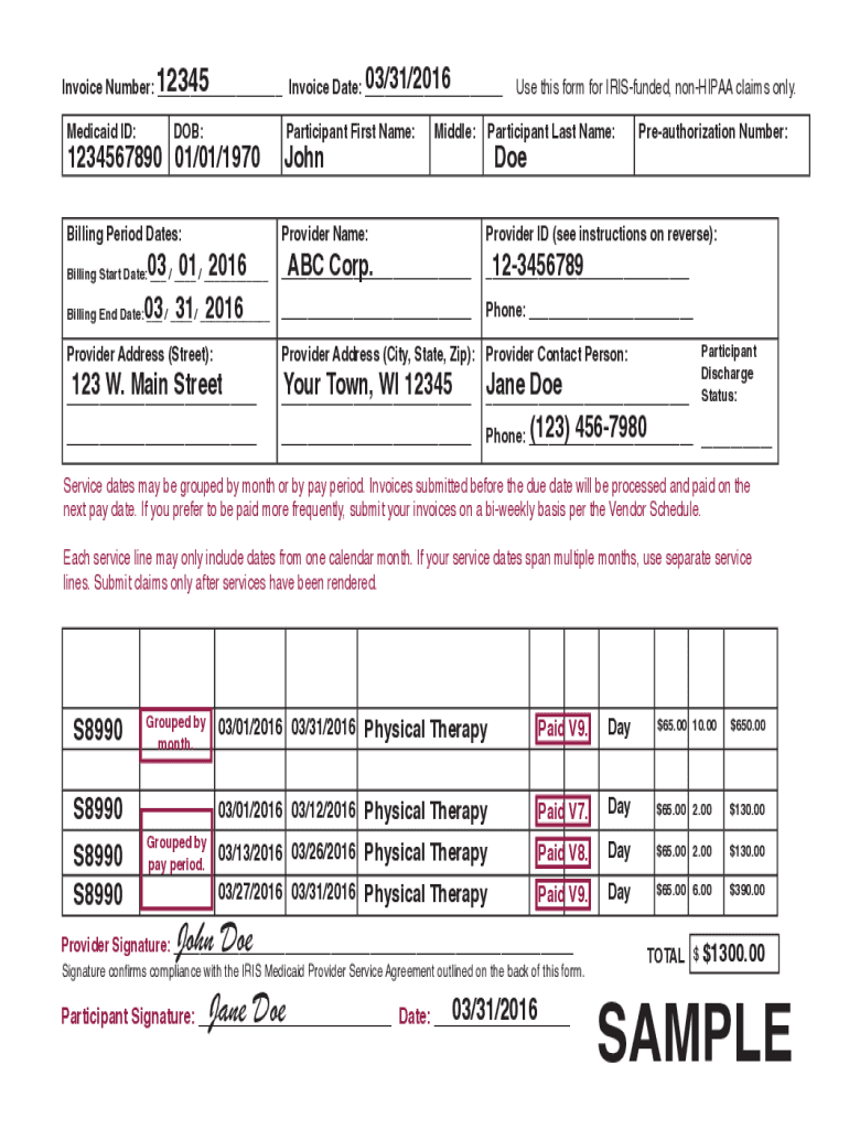 Medicaid ID:DOB:Participant First Name:Middle:Use this form for IRIS funded, nonhuman claims only. Participant Last Name:1234567890 01/01/1970JohnBilling