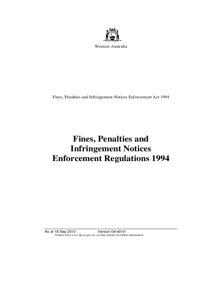 Western Australianizes, Penalties and Infringement Notices Enforcement Act 1994Fines, Penalties and Infringement Notices Enforcement Regulations 1994As at 18 Sep 2010Version 04e001Extract from www.slp.wa.gov.au,