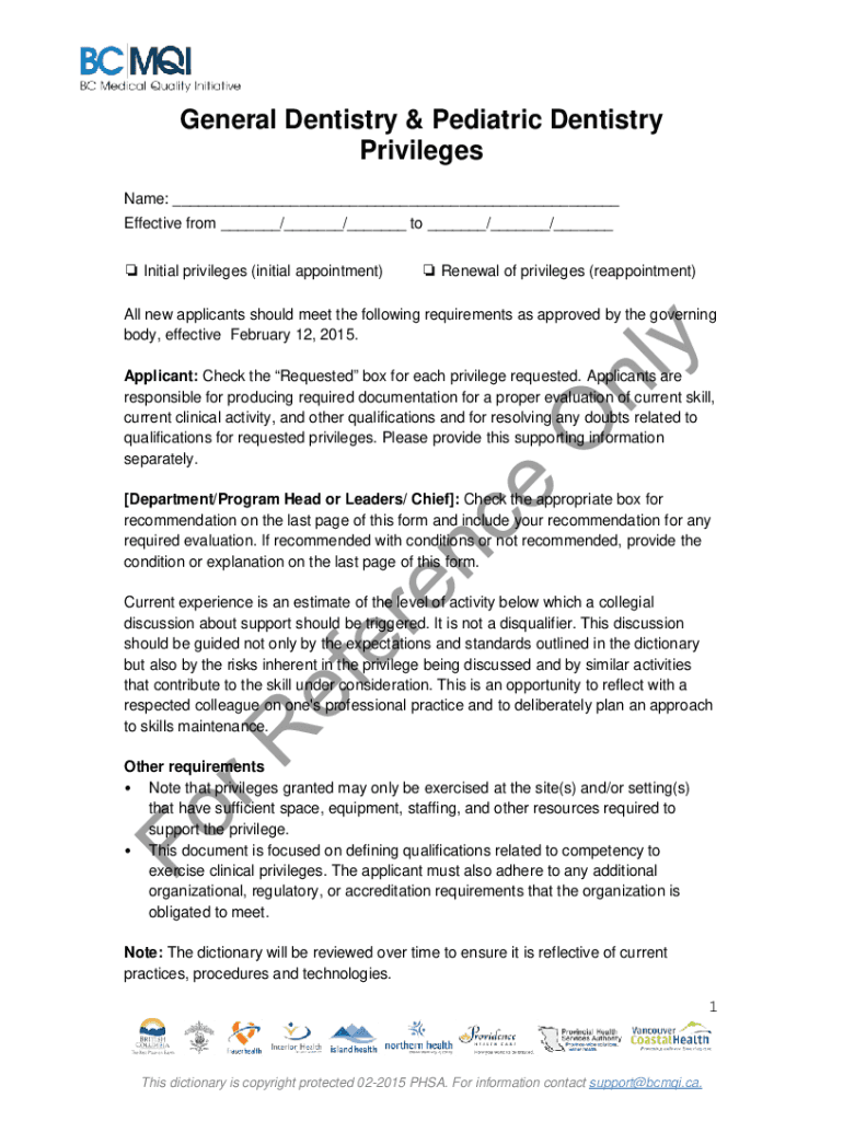 General Dentistry & Pediatric Dentistry Privileges Name: ___ Effective from ___/___/___ to ___/___/___ Initial privileges (initial appointment) Renewal of privileges (reappointment)All new applicants