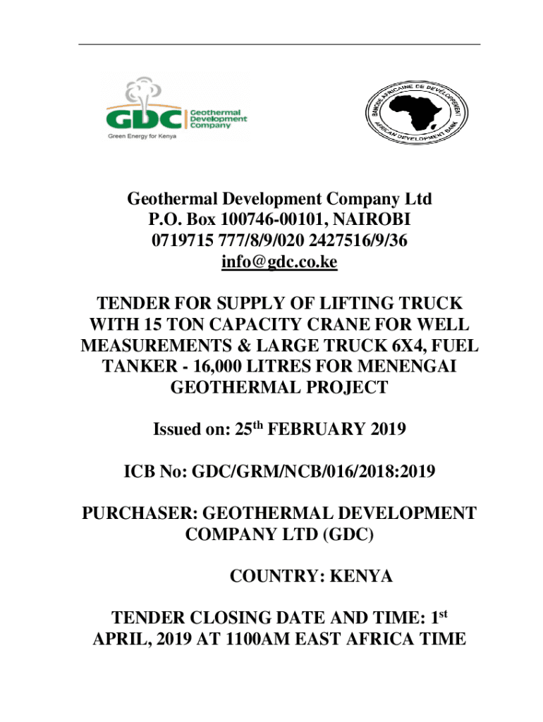Geothermal Development Company Ltd P.O. Box 10074600101, NAIROBI 0719715 777/8/9/020 2427516/9/36 info@gdc.co.ke TENDER FOR SUPPLY OF LIFTING TRUCK WITH 15 TON CAPACITY CRANE FOR WELL MEASUREMENTS