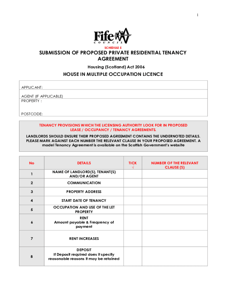 1SCHEDULE 5SUBMISSION OF PROPOSED PRIVATE RESIDENTIAL TENANCY AGREEMENT Housing (Scotland) Act 2006HOUSE IN MULTIPLE OCCUPATION License APPLICANT: AGENT (IF APPLICABLE) PROPERTY :POSTCODE: TENANCY