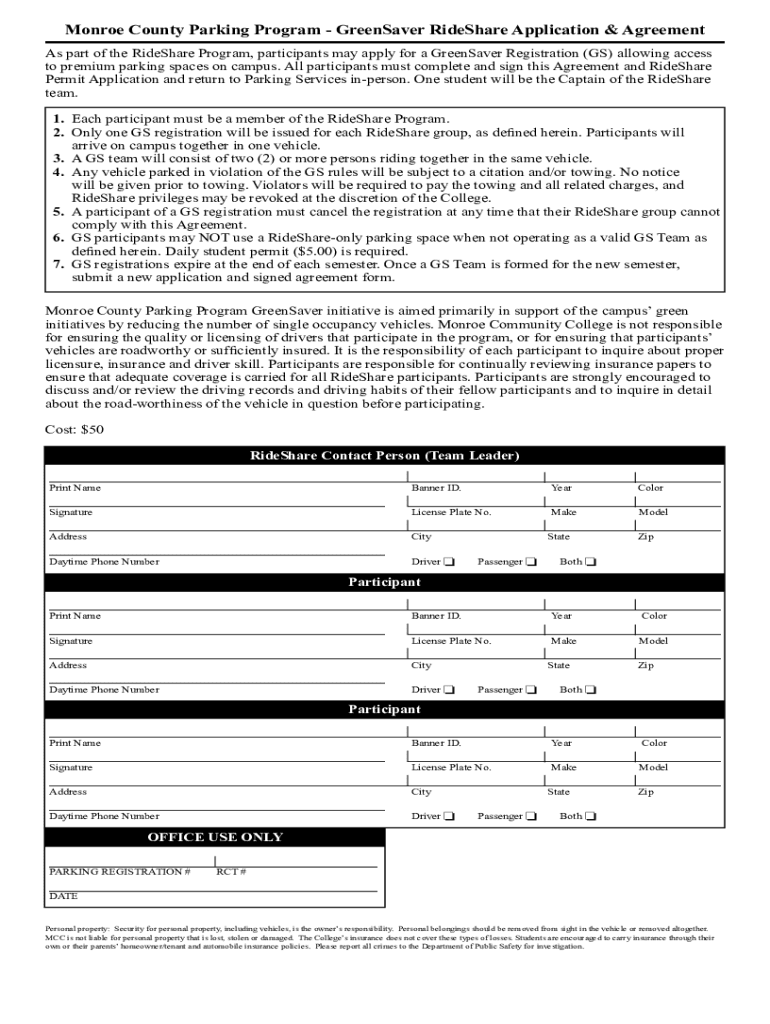 Monroe County Parking Program Green Saver Ride Share Application & Agreement As part of the Ride Share Program, participants may apply for a Green Saver Registration (GS) allowing access to premium