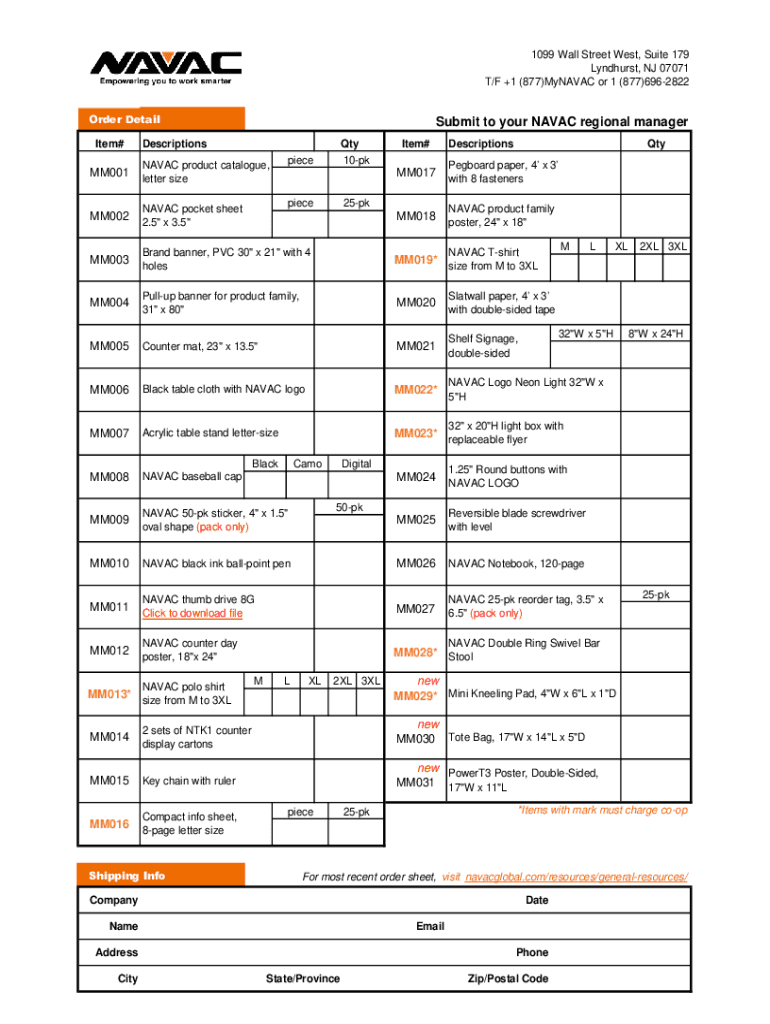 1099 Wall Street West, Suite 179 Sandhurst, NJ 07071 T/F +1 (877)Myna VAC or 1 (877)6962822 Order Detail Item#Submit to your NAVAL regional managerDescriptionsMM001NAVAC product catalog, letter sizepieceNAVAC