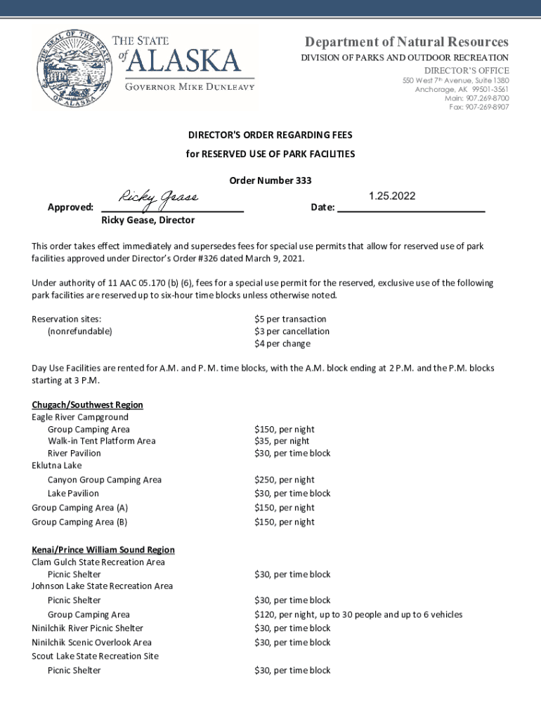 Department of Natural Resources DIVISION OF PARKS AND OUTDOOR RECREATION DIRECTORS OFFICE550 West 7th Avenue, Suite 1380 Anchorage, AK 995013561 Main: 907.2698700 Fax: 9072698907DIRECTOR\'S ORDER
