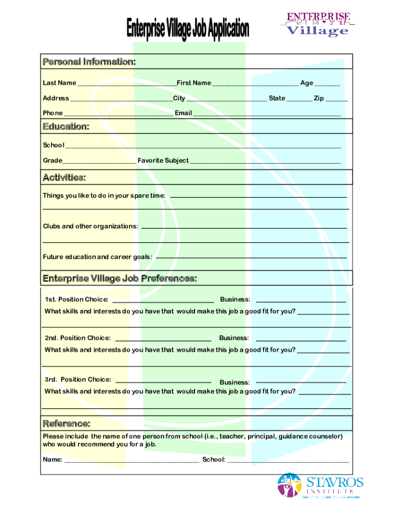 Personal Information: Last Name ___First Name ___ Age ___ Address ___City ___ State ___ Zip ___ Phone ___ Email ___Education: School ___ Grade___ Favorite Subject ___Activities: Things you like to