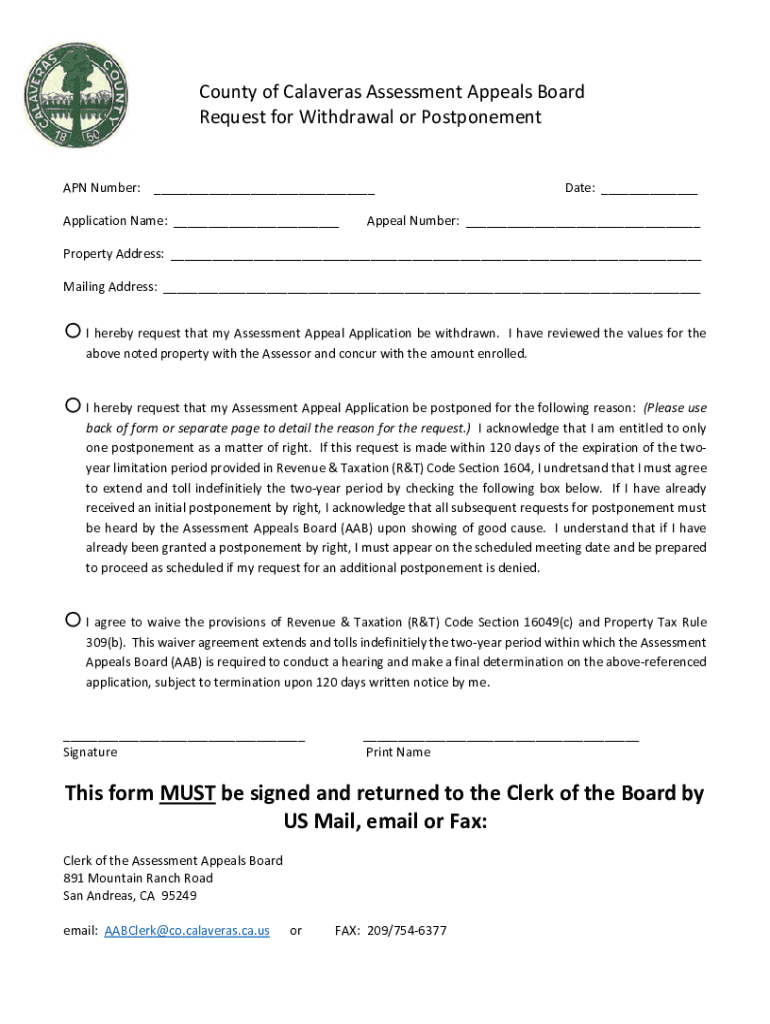 County of Calaveras Assessment Appeals Board Requests for Withdrawal or Postponement APN Number: ___ Application Name: ___Date: ___Appeal Number: ___Property Address: ___ Mailing Address: ___o I hereby