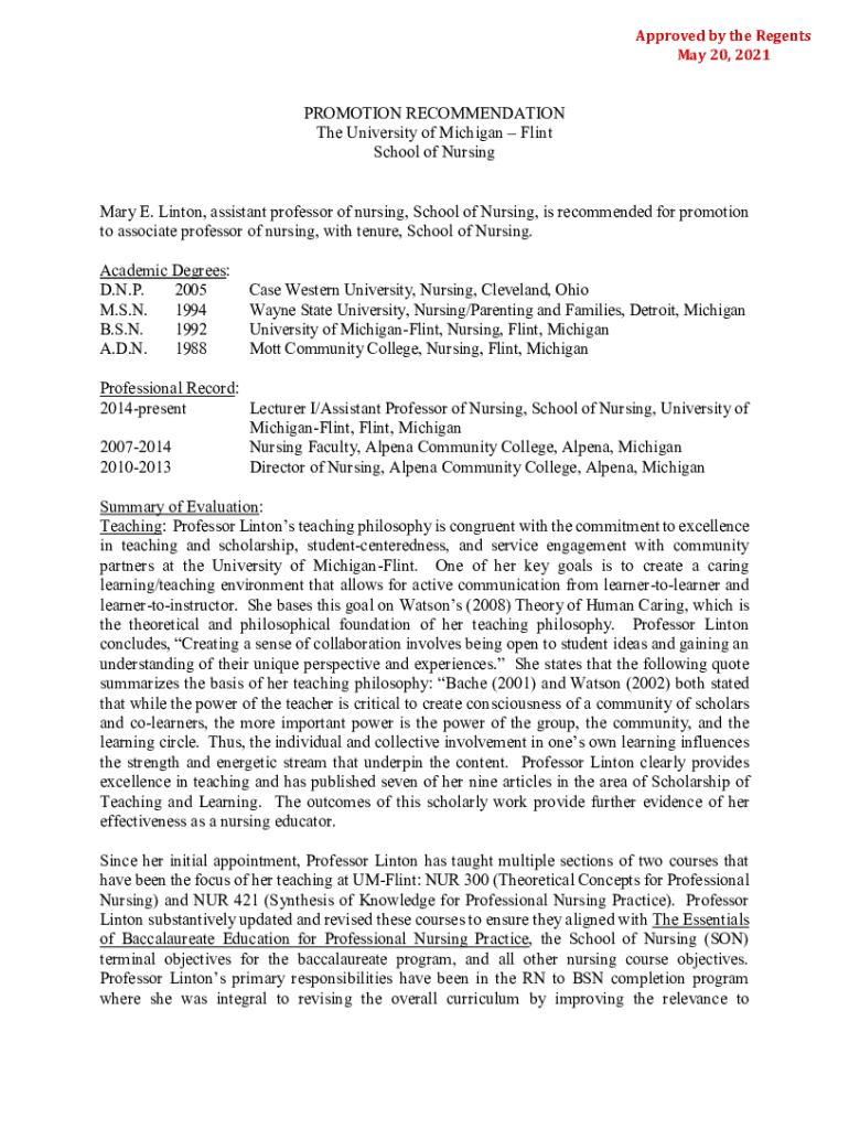 Approved by the Regents May 20, 2021PROMOTION RECOMMENDATION The University of Michigan Flint School of Nursing Mary E. Linton, assistant professor of nursing, School of Nursing, is recommended for