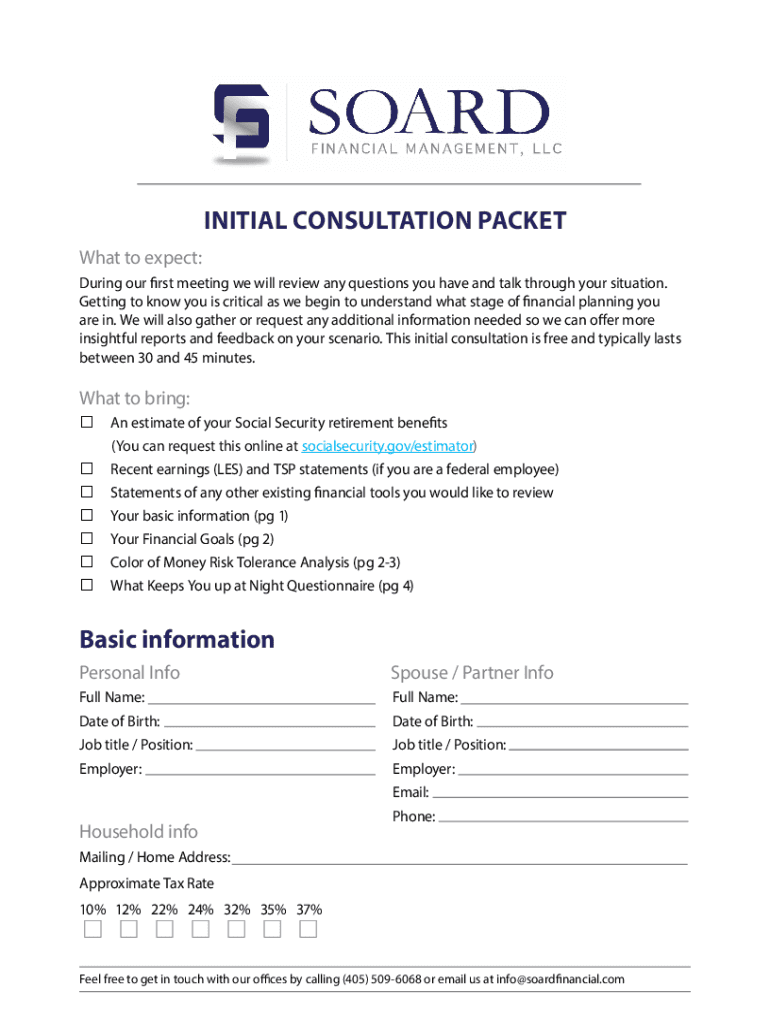 INITIAL CONSULTATION PACKET What to expect: During our first meeting we will review any questions you have and talk through your situation. Getting to know you is critical as we begin to understand