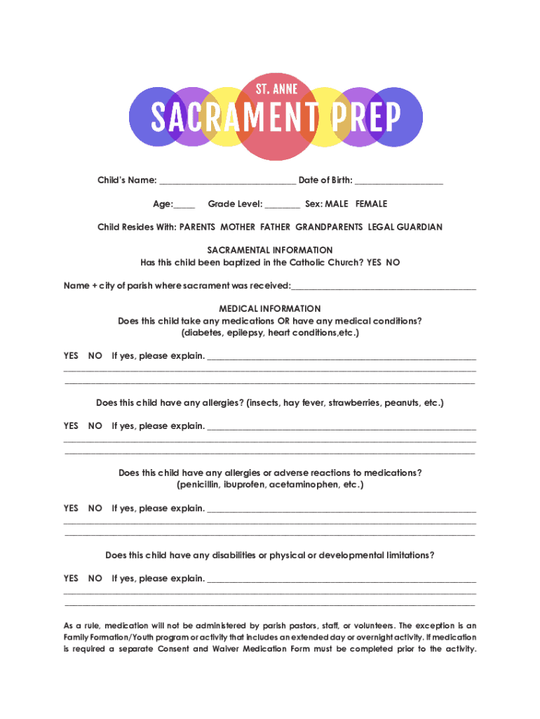 Child's Name: ___ Date of Birth: ___ Age:___Grade Level: ___ Sex: MALE FEMALEChild Resides With: PARENTS MOTHER FATHER GRANDPARENTS LEGAL GUARDIAN SACRAMENTAL INFORMATION Has this child been baptized