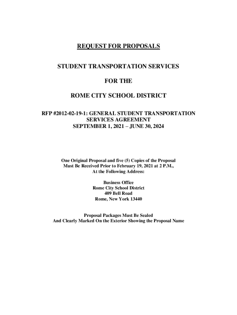 REQUEST FOR PROPOSALS STUDENT TRANSPORTATION SERVICES FOR THE ROME CITY SCHOOL DISTRICT RFP #201202191: GENERAL STUDENT TRANSPORTATION SERVICES AGREEMENT SEPTEMBER 1, 2021, JUNE 30, 2024One Original