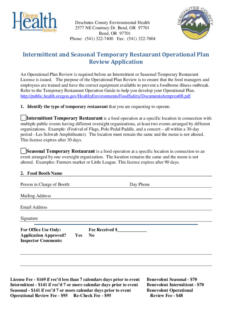 Descartes County Environmental Health 2577 NE Courtney Dr. Bend, OR 97701 Bend, OR 97701 Phone: (541) 3227400 Fax: (541) 3227604Intermittent and Seasonal Temporary Restaurant Operational Plan Review