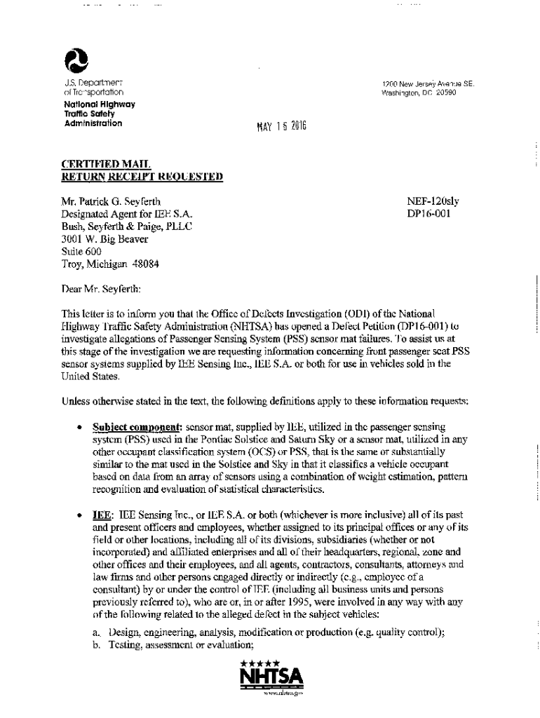 U.S. Department of Transportation National Highway Traffic Safety Administration1200 New Jersey Avenue SE. Washington, DC 20590MAY 16 2016CERTIFIED MAIL RETURN RECEIPT REQUESTED Mr. Patrick G. SeyferthNEF120sly