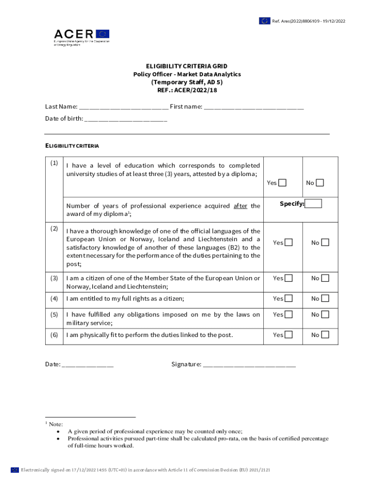 Ref. Ares(2022)8806109 19/12/2022ELIGIBILITY CRITERIA GRID Policy Officer Market Data Analytics (Temporary Staff, AD 5) REF.: ACER/2022/18 Last Name: ___ First name: ___ Date of birth: ___ELIGIBILITY