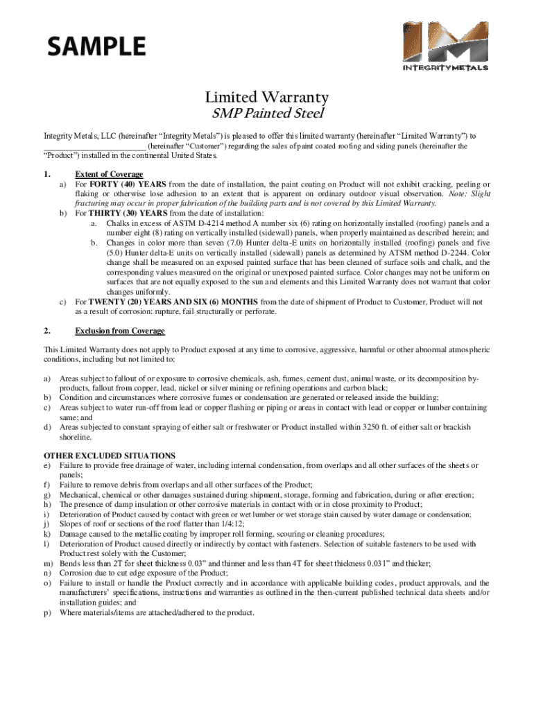Limited Warranty SVP Painted Steel Integrity Metals, LLC (hereinafter Integrity Metals) is pleased to offer this limited warranty (hereinafter Limited Warranty) to ___ (hereinafter Customer) regarding