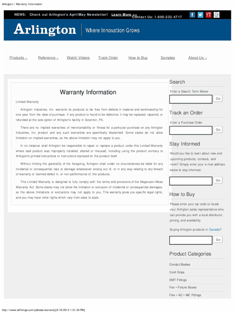 Arlington | Warranty Informativeness:ProductsCheck out Arlington\'s April/May Newsletter! ReferenceWatch VideosLearn More