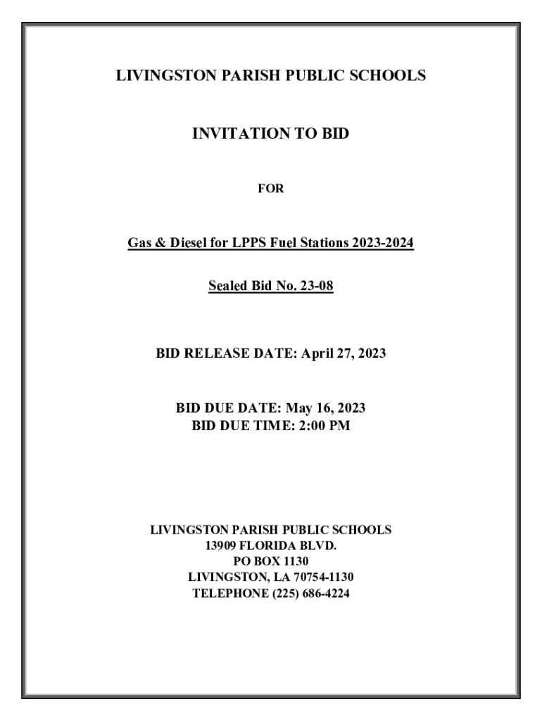 LIVINGSTON PARISH PUBLIC SCHOOLS INVITATION TO BID Forges & Diesel for LAPS Fuel Stations 20232024 Sealed Bid No. 2308BID RELEASE DATE: April 27, 2023BID DUE DATE: May 16, 2023, BID DUE TIME: 2:00