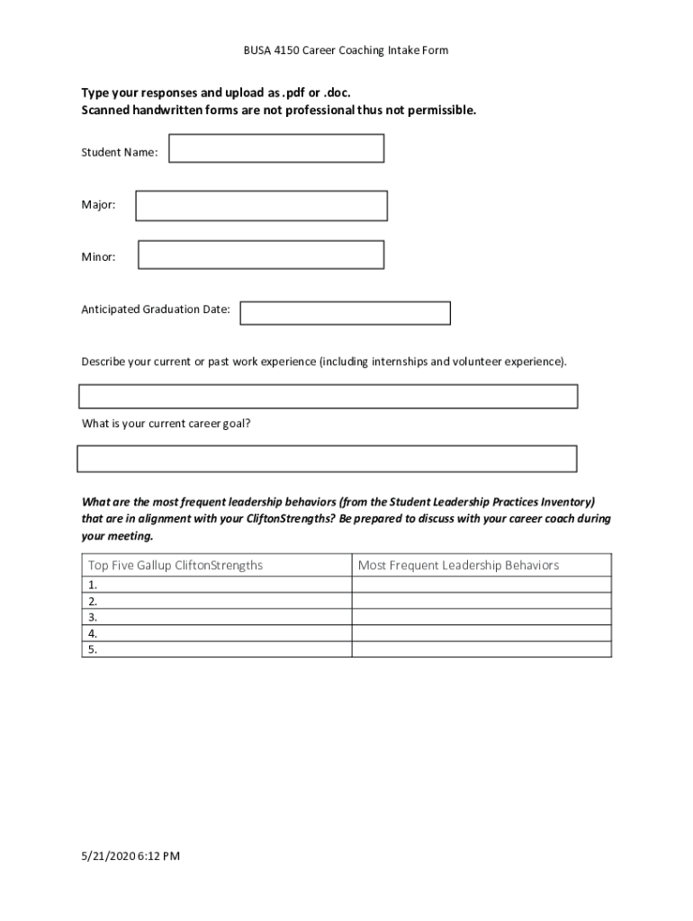 BUS 4150 Career Coaching Intake Forty your responses and upload as .pdf or .doc. Scanned handwritten forms are not professional thus not permissible. Student Name:Major:Minor:Anticipated Graduation