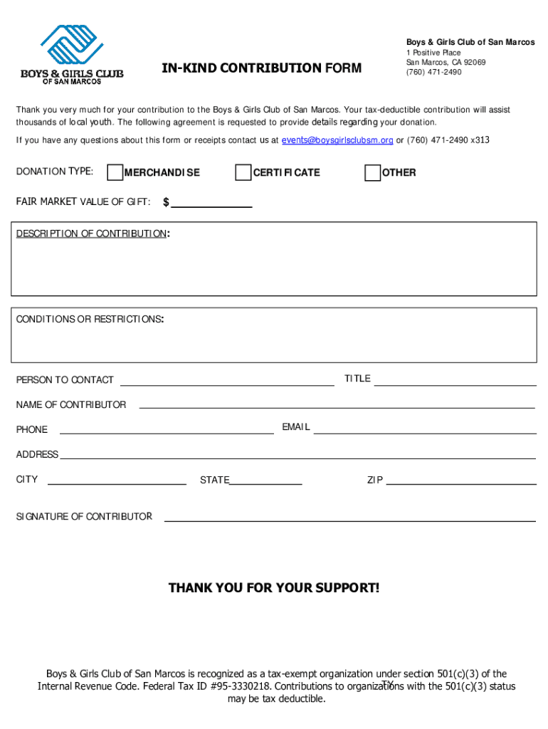 (760) 4712490INKIND CONTRIBUTION Firsthand you very much for your contribution to the Boys & Girls Club of San Marcos. Your tax-deductible