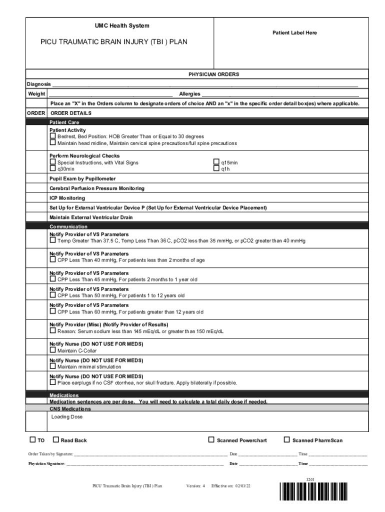 Patient Label Heretics TRAUMATIC BRAIN INJURY (TBI) PATAPHYSICIAN ORDERS