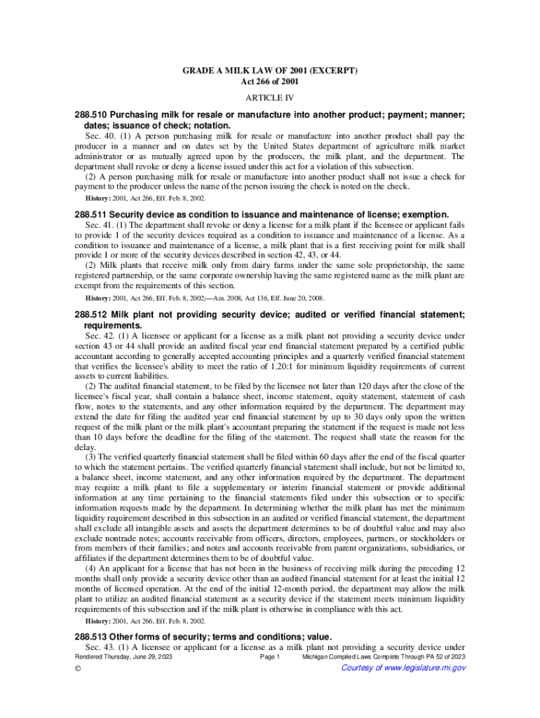 GRADE A MILK LAW OF 2001 (EXCERPT) Act 266 of 2001 ARTICLE IV 288.510 Purchasing milk for resale or manufacture into another product; payment; manner; dates; issuance of check; notation. Sec. 40.