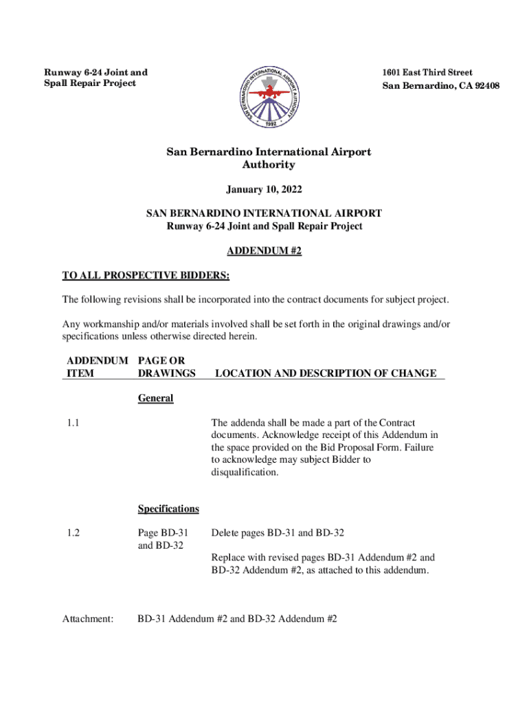 Runway 624 Joint and Small Repair Project1601 East Third Street San Bernardino, CA 92408San Bernardino International Airport Authority January 10, 2022, SAN BERNARDINO INTERNATIONAL AIRPORT Runway