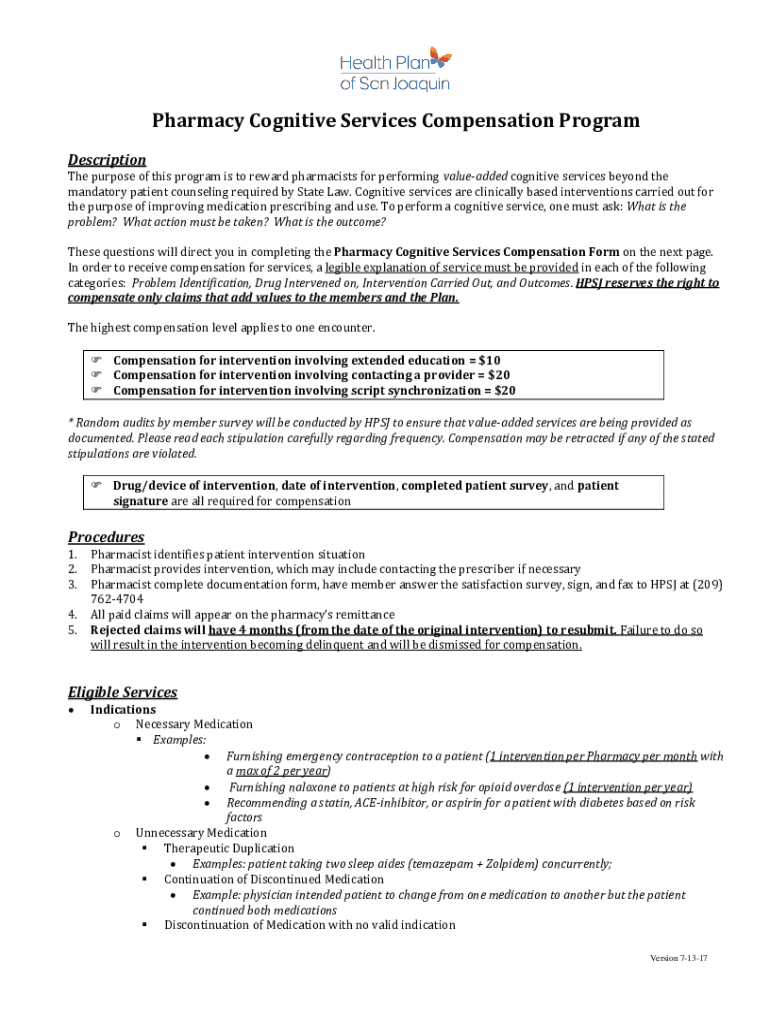 Get the free Pharmacy Cognitive Services Compensation Program