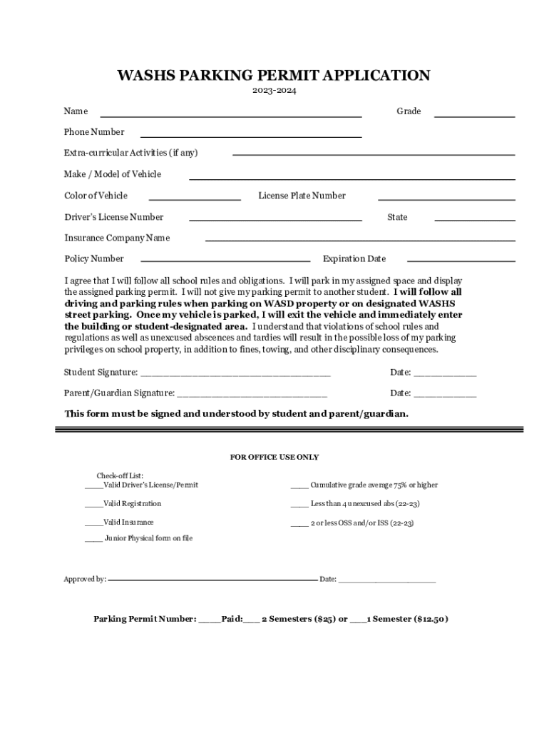 WASH SPARKING PERMIT APPLICATION 20232024NameGradePhone Number Extracurricular Activities (if any) Make / Model of Vehicle Color of VehicleLicense Plate NumberDrivers License NumberStateInsurance