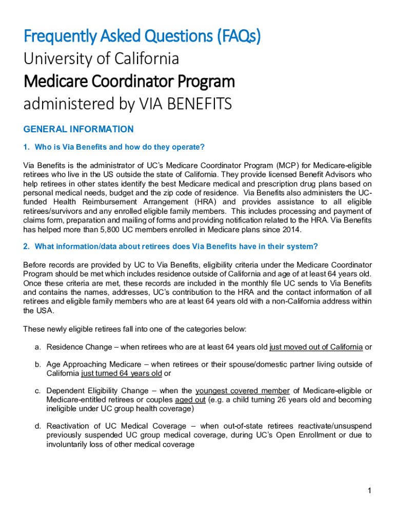 Frequently Asked Questions (FAQs) University of California Medicare Coordinator Program administered by VIA BENEFITS GENERAL INFORMATION 1. Who is Via Benefits, and how do they operate? Via Benefits
