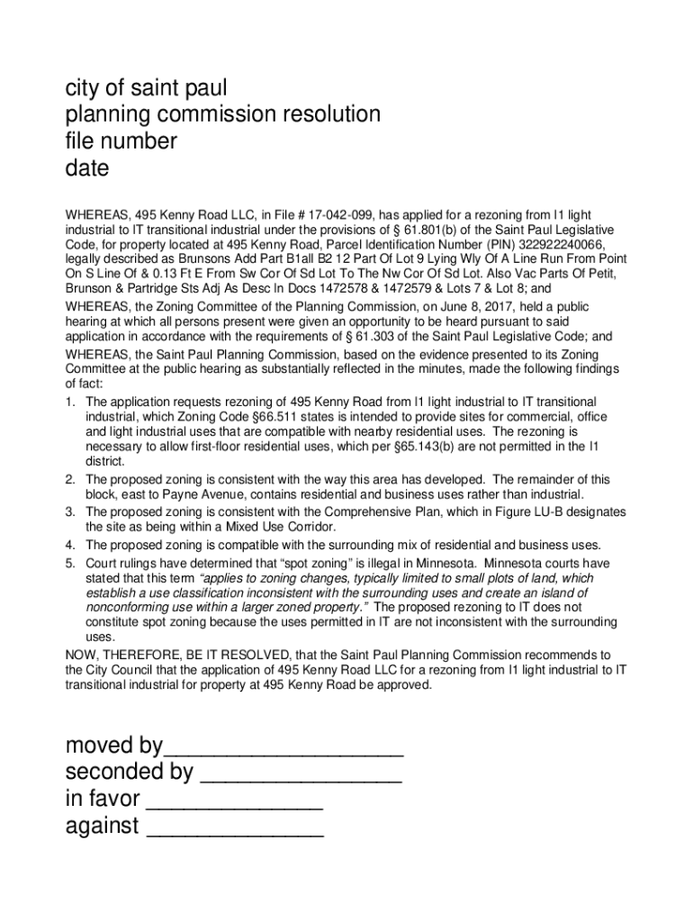City of Saint Paul planning commission resolution file number date WHEREAS, 495 Kenny Road LLC, in File # 17042099, has applied for a rezoning from I1 light industrial to IT transitional industrial