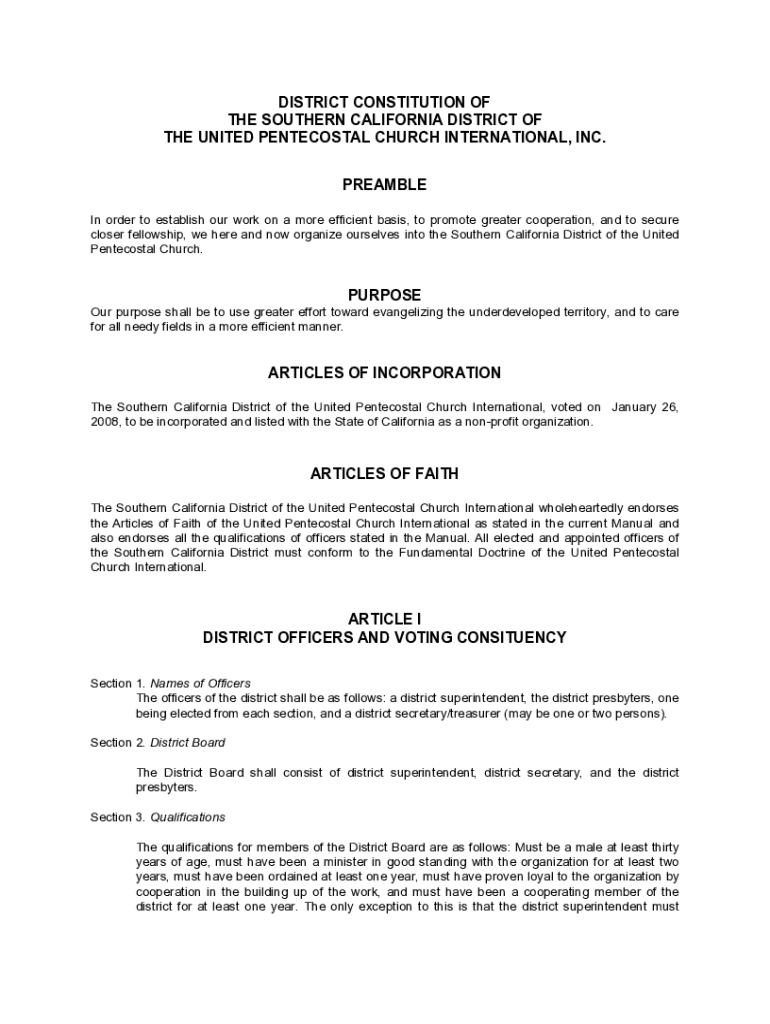 DISTRICT CONSTITUTION OF THE SOUTHERN CALIFORNIA DISTRICT OF THE UNITED PENTECOSTAL CHURCH INTERNATIONAL, INC. PREAMBLE In order to establish our work on a more efficient basis, to promote greater