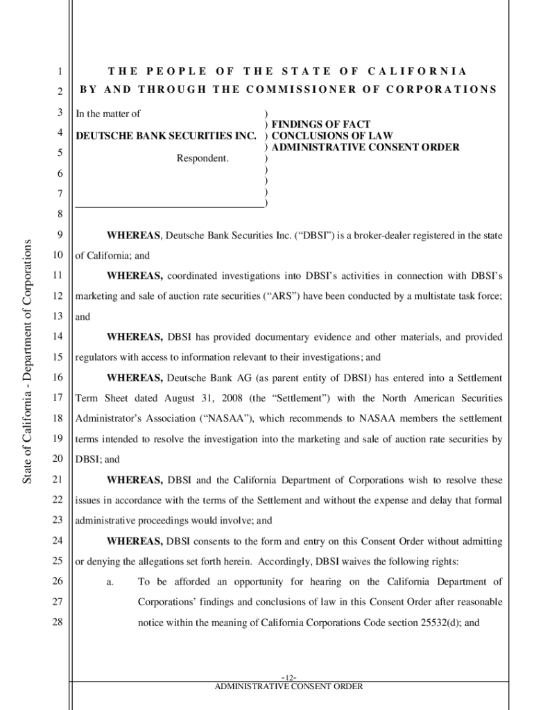 1THE PEOPLE OF THE STATE OF CALIFORNIA2BY AND THROUGH THE COMMISSIONER OF CORPORATIONS3 4 5 6 7In the matter of)) FINDINGS OF FACT DEUTSCHE BANK SECURITIES INC.) CONCLUSIONS OF LAW) ADMINISTRATIVE
