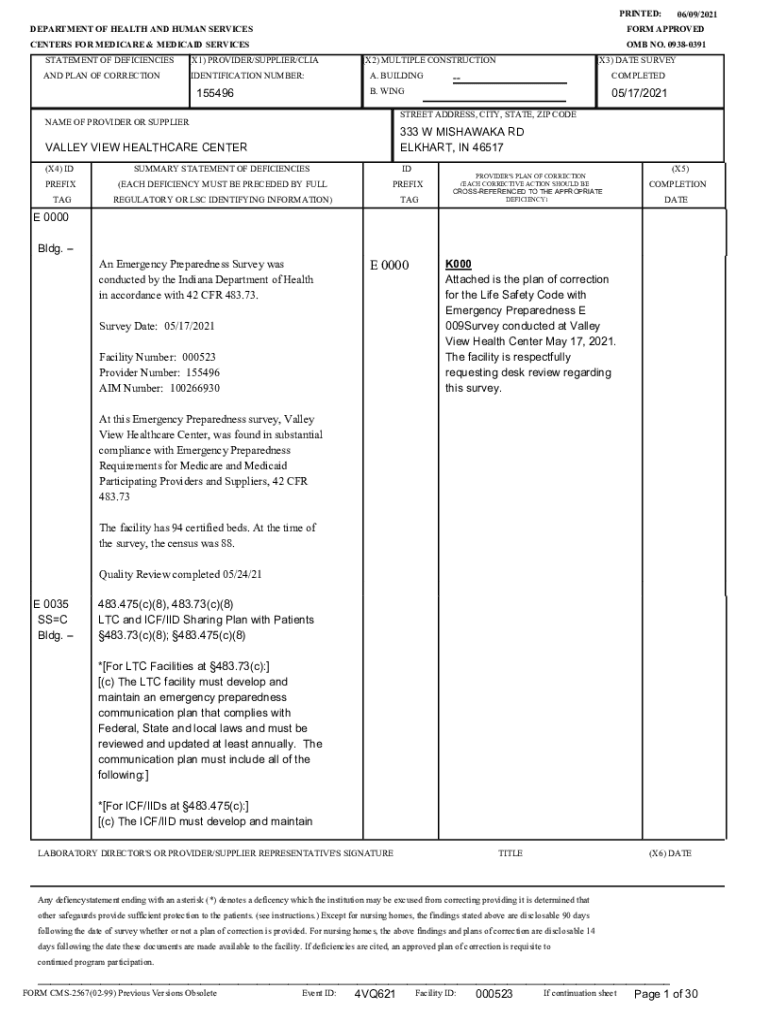 PRINTED: DEPARTMENT OF HEALTH AND HUMAN SERVICES CENTERS FOR MEDICARE & MEDICAID SERVICES STATEMENT OF DEFICIENCIES(X1) PROVIDER/SUPPLIER/LIGAND PLAN OF CORRECTIONIDENTIFICATION NUMBER:15549606/09/2021FORM