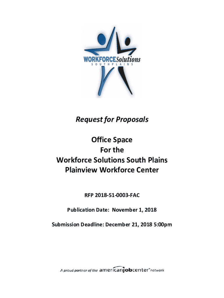 Request for Proposals Office Space For the Workforce Solutions South Plains Plain view Workforce Center RFP 2018510003FAC Publication Date: November 1, 2018, Submission Deadline: December 21, 2018
