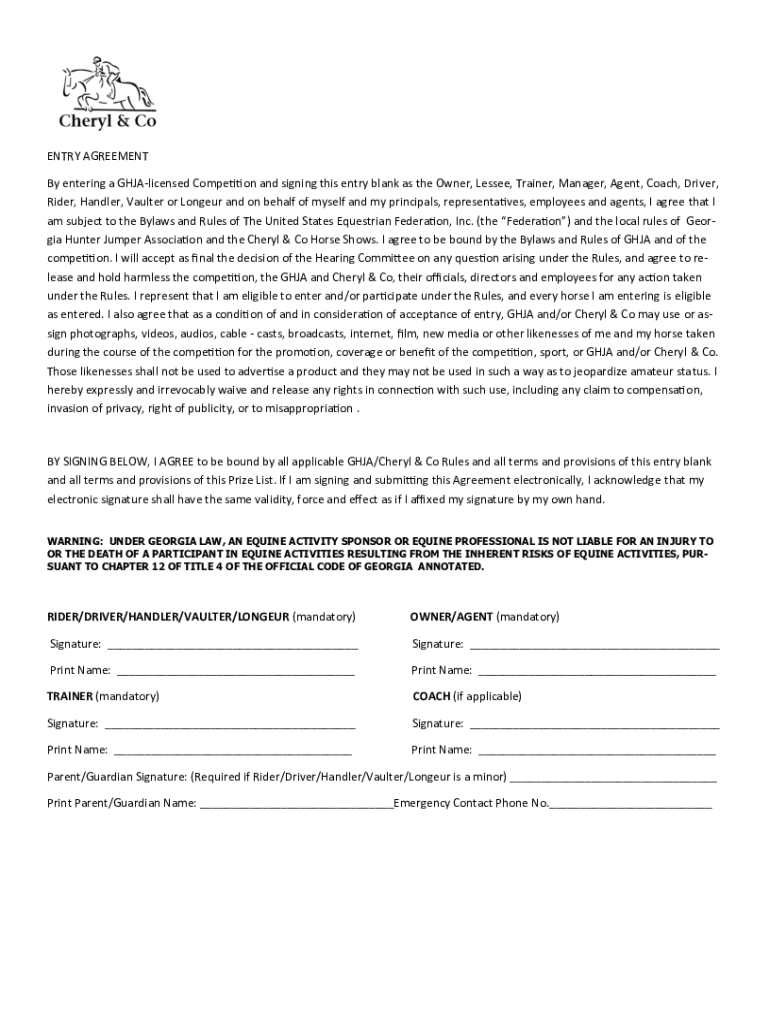 ENTRY AGREEMENT By entering a GHJAlicensed Competition and signing this entry blank as the Owner, Lessee, Trainer, Manager, Agent, Coach, Driver, Rider, Handler, Vaulter or Longer and on behalf of