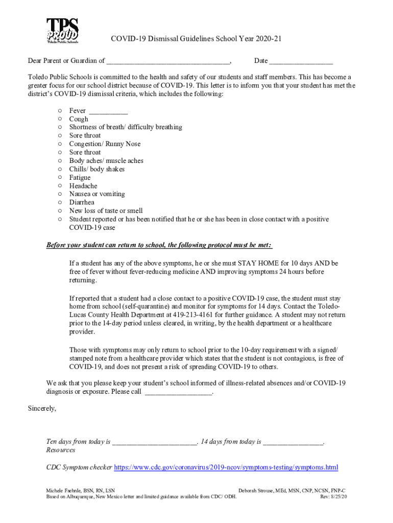 COVID-19 Dismissal Guidelines School Year 202021 Dear Parent or Guardian of ___, Date ___Toledo Public Schools is committed to the health and safety of our students and staff members. This has become