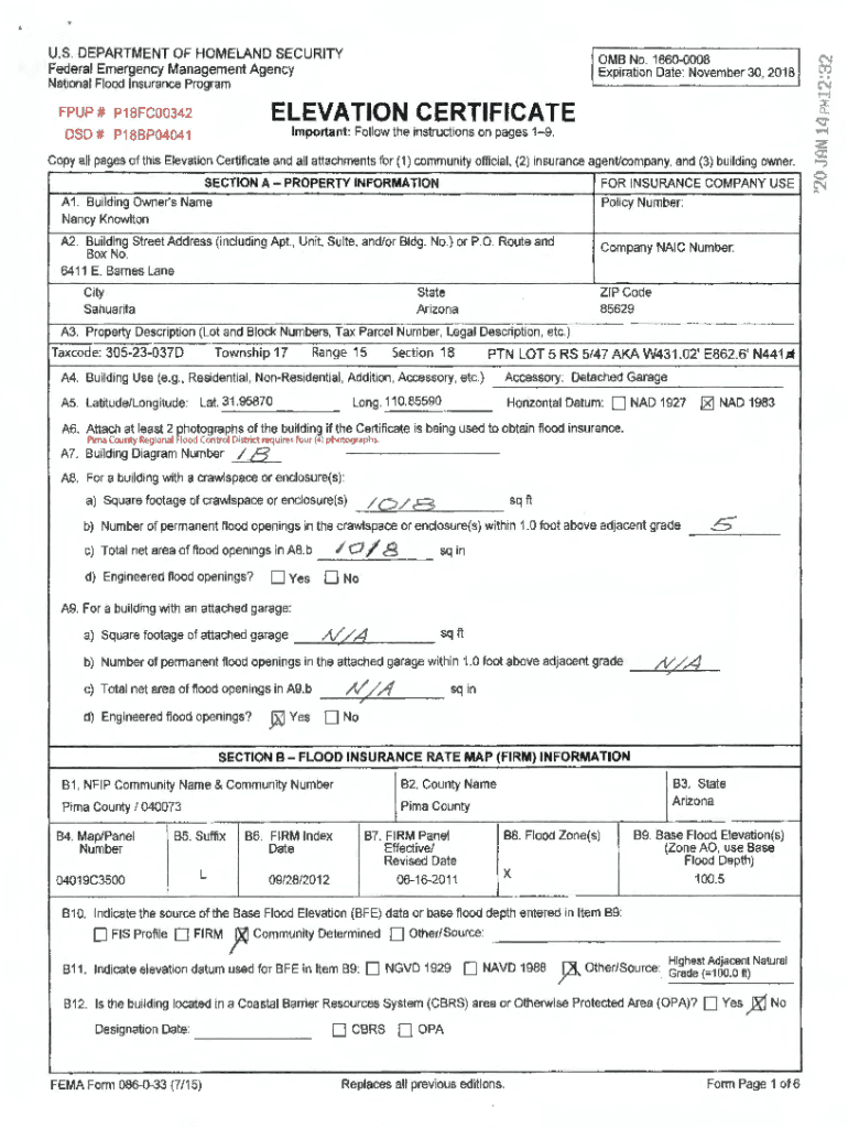 U.S. DEPARTMENT OF HOMELAND SECURITY Federal Emergency Management Agency National Flood Insurance Program0MB No. 16600008 Expiration Date: November 30, 2018FPUP # P18FC00342ELEVATION CERTIFICATE DSD