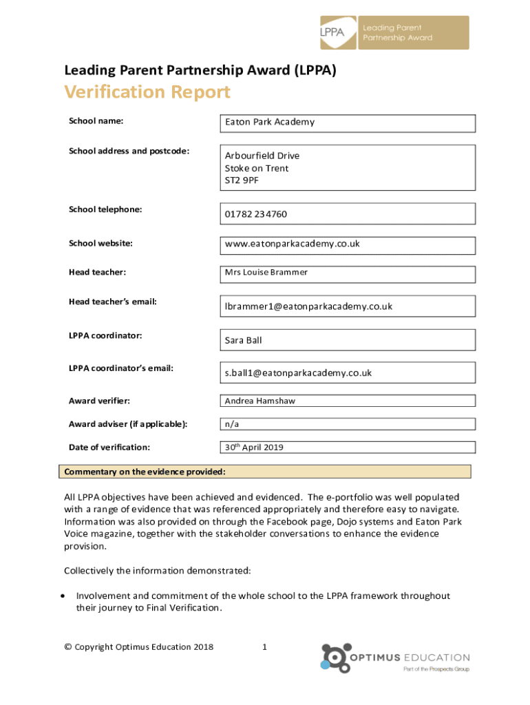Leading Parent Partnership Award (LPP)Verification Report School name:Eaton Park AcademySchool address and postcode:Arbourfield Drive Stoke-on-Trent ST2 9PFSchool telephone:01782 234760School website:www.eatonparkacademy.co.ukHead