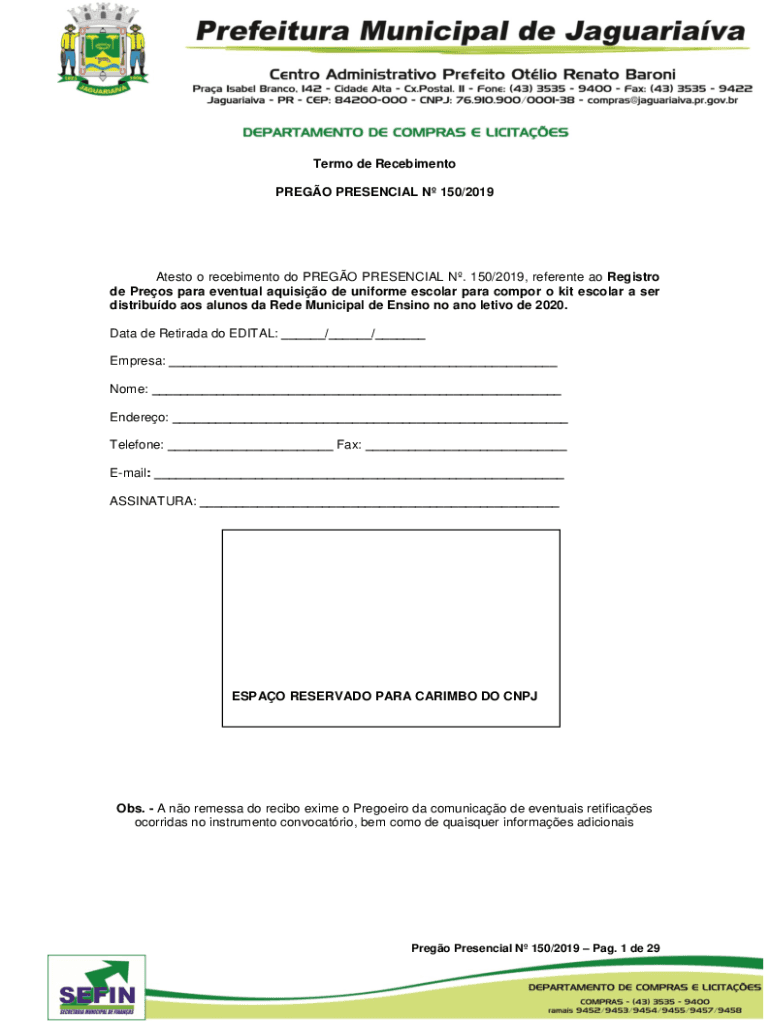 PRESO PRESENCE N 150/2019Atesto o recebimento do PRESO PRESENCE N. 150/2019, reference AO Registry