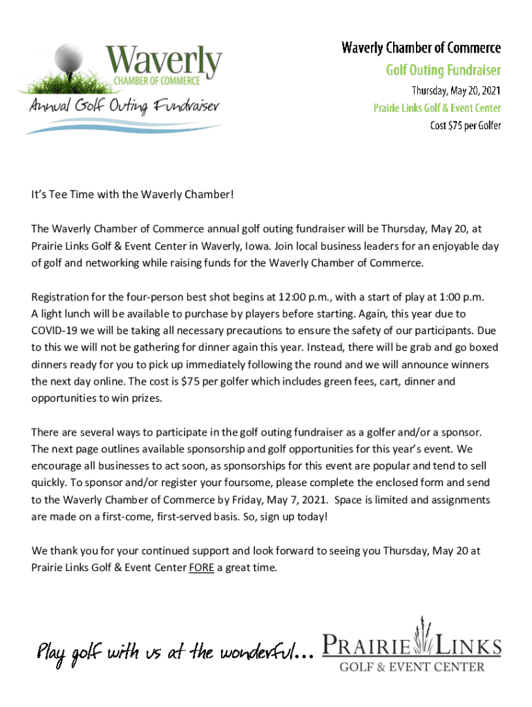 Its Tee Time with the Waverley Chamber! The Waverley Chamber of Commerce annual golf outing fundraiser will be Thursday, May 20, at Prairie Links Golf & Event Center in Waverley, Iowa. Join local