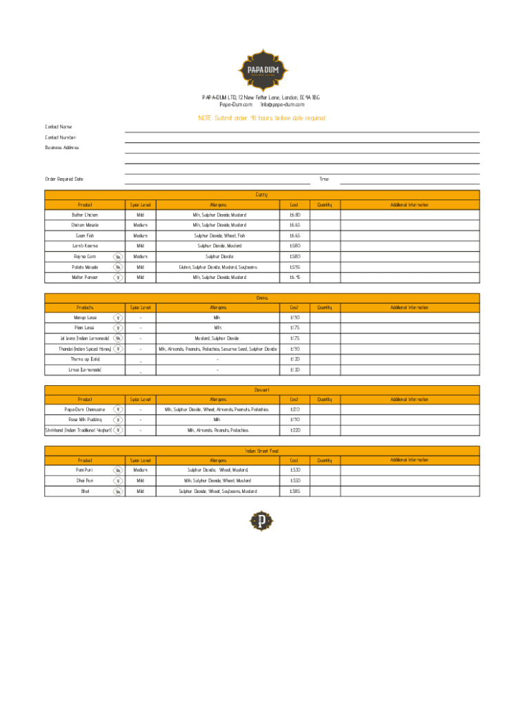 PapaDum.com Info@papadum.comNOTE: Submit order 48 hours before date required