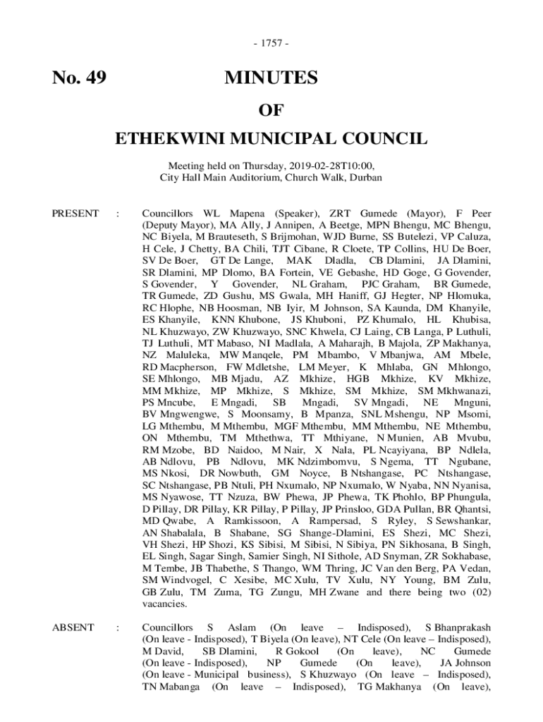 City Hall Main Auditorium, Church Walk, DurbanPRESENT:Councillors WE Arena (Speaker), ART Guide (Mayor),