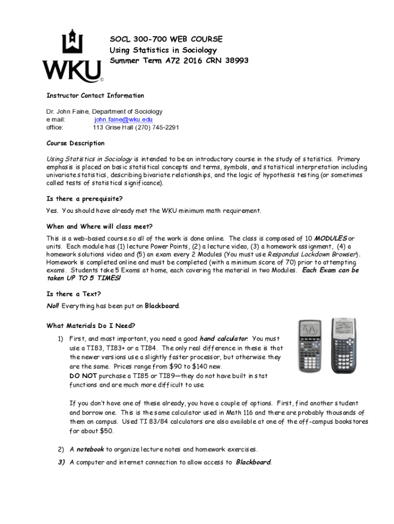 SOIL 300700 WEB COURSE Using Statistics in Sociology Summer Term A72 2016 CRN 38993Instructor Contact Information Dr. John Fine, Department of Sociology e-mail: john.faine@wku.edu office: 113 Rise
