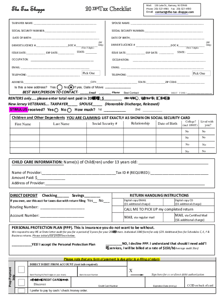 The Tax ShoppeMail: 155 Lake St., Ramsey, NJ 07446 Phone: 2013274965 Fax: 2013274930 Email: contact@thetaxshoppe.com20 Tax ChecklistTAXPAYER NAME: ___SPOUSE NAME: ___SOCIAL SECURITY NUMBER:___SOCIAL