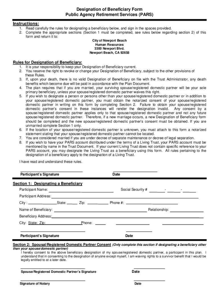 Designation of Beneficiary Form Public Agency Retirement Services (PARS) Instructions: 1. Read carefully the rules for designating a beneficiary below, and sign in the spaces provided. 2. Complete