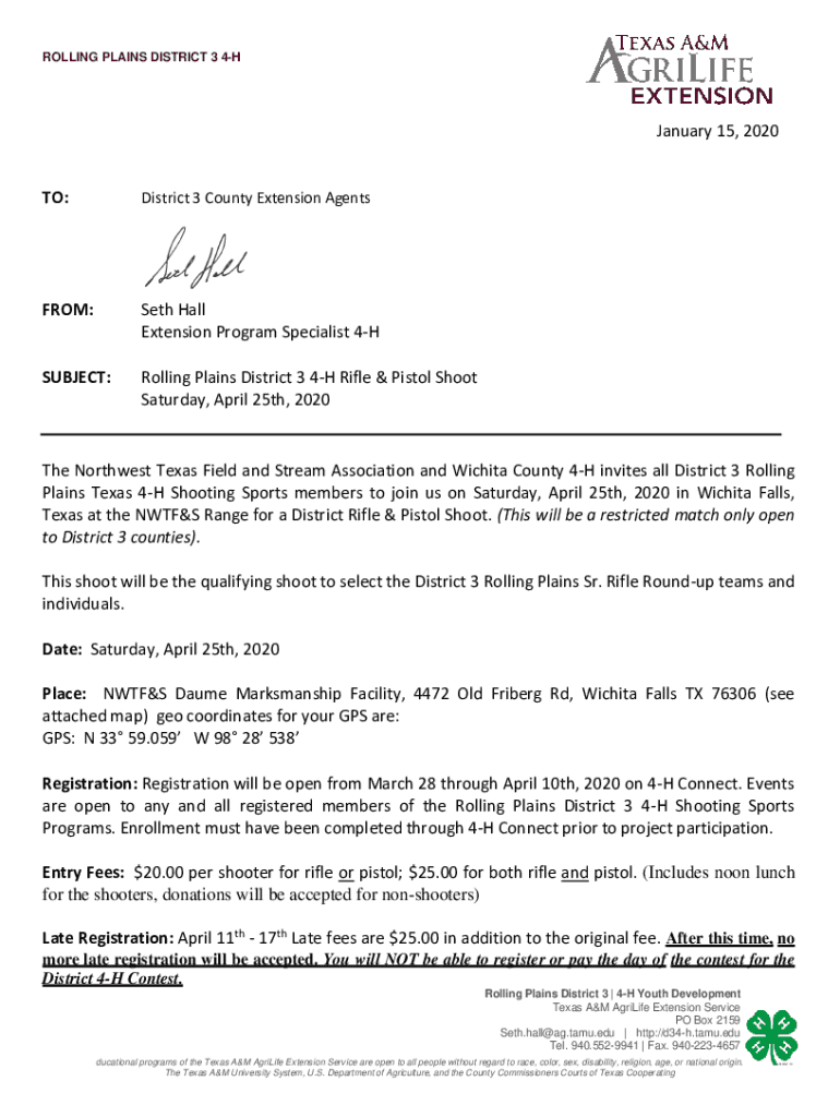 ROLLING PLAINS DISTRICT 3 4HJanuary 15, 2020 TO:District 3 County Extension AgentsFROM:Seth Hall Extension Program Specialist 4HSUBJECT:Rolling Plains District 3 4H Rifle & Pistol Shoot Saturday,