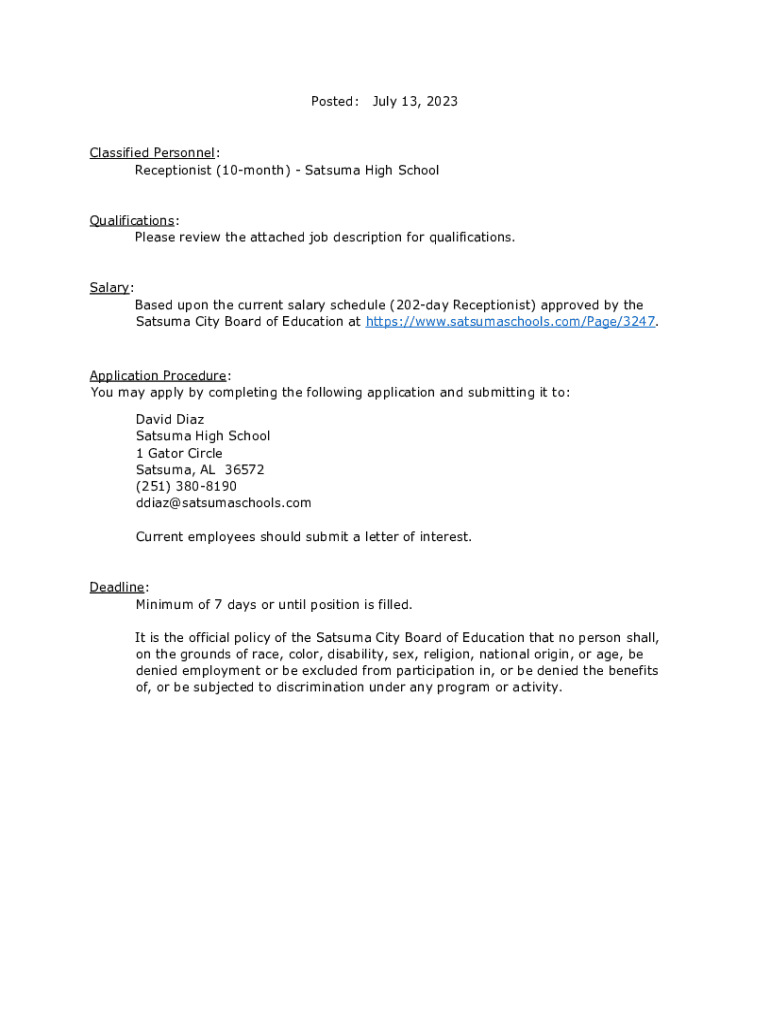 Posted:July 13, 2023Classified Personnel: Receptionist (10month) Satsuma High SchoolQualifications: Please review the attached job description for qualifications. Salary: Based upon the current salary