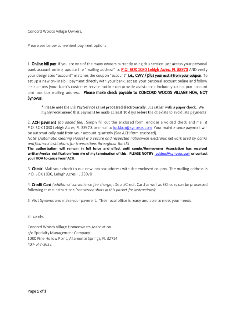 Concord Woods Village Owners, Please see below convenient payment options:1. Online bill pay: If you are one of the many owners currently using this service, just access your personal bank account
